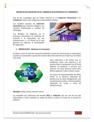Este documento describe los principales modelos de negocios en el comercio electrónico, incluyendo: B2C (negocios a consumidores), B2B (negocios a negocios), C2C (consumidores a consumidores), C2B (consumidores a negocios), M2B (comercio móvil), G2B (gobierno a negocios) y B2G (negocios a gobierno). Explica las características clave de cada modelo y proporciona ejemplos de empresas que utilizan con éxito cada uno