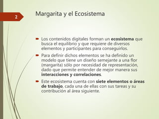 El documento describe el modelo Margarita, el cual representa los siete elementos clave de un ecosistema de contenidos digitales. Cada elemento contribuye al siguiente y juntos buscan lograr el equilibrio del ecosistema. Los elementos son: definir, crear, mediatizar, interactivar, envasar, publicar y gestionar.