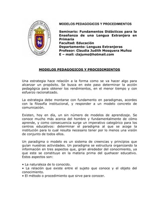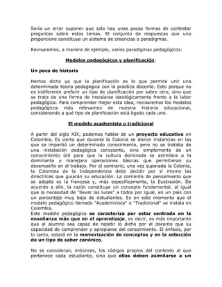 Este documento describe varios modelos pedagógicos y sus procedimientos de planificación asociados. Comienza explicando el modelo académico o tradicional, centrado en la enseñanza y la memorización. Luego describe el modelo conductista, enfocado en el aprendizaje a través del refuerzo. Finalmente, introduce brevemente el modelo constructivista y cognitivo, centrado en el aprendizaje significativo.