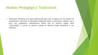 Este documento describe diferentes modelos pedagógicos, incluyendo el modelo tradicional que se enfoca en la disciplina y repetición, el modelo activista que promueve el aprendizaje haciendo, el modelo conceptual que se enfoca en conceptos básicos y habilidades, y el modelo constructivista donde los estudiantes construyen conocimiento de forma personal y colectiva.
