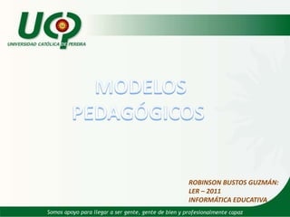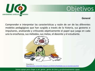 Este documento describe varios modelos pedagógicos, incluyendo el tradicional, romántico, conductista, constructivista y socio-cognitivo. Explica las metas, métodos, roles del maestro y estudiante, y contenidos de cada modelo. También incluye objetivos, competencias, unidades de contenido, actividades, y recursos bibliográficos relacionados con los diferentes modelos pedagógicos.