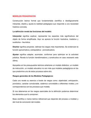 Los modelos pedagógicos son construcciones teóricas fundamentadas científica e ideológicamente que interpretan, diseñan y ajustan la realidad pedagógica para responder a necesidades históricas. Tienen funciones como ilustrar, proyectar y transformar procesos pedagógicos. Los modelos se basan en paradigmas científicos y proveen marcos teóricos para comprender y mejorar la educación.