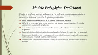 El documento presenta una descripción de varios modelos pedagógicos: el modelo pedagógico tradicional, el modelo pedagógico activista, el modelo pedagógico conceptual, el modelo pedagógico marxista y el modelo pedagógico constructivista. Para cada modelo, se describen sus principios educativos, objetivos, metodologías y enfoques sobre contenidos, recursos, y evaluación.