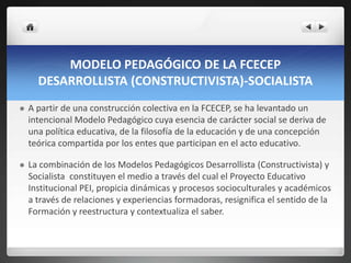 El modelo pedagógico de la FCECEP se basa en los enfoques constructivista y socialista (1). Combina dinámicas socioculturales y académicas a través de relaciones y experiencias que resignifican la formación y contextualizan el conocimiento (2). El profesor facilita el aprendizaje significativo mediante actividades dentro y fuera del aula, trabajando en equipo y basándose en los aportes de los estudiantes (3).