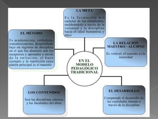 Este documento discute varios modelos pedagógicos, incluyendo el modelo pedagógico tradicional, el modelo romántico o naturalista, y el modelo conductista. Explica brevemente las características de cada modelo y cómo han evolucionado a través de la historia, con el objetivo de encontrar un modelo pedagógico que satisfaga los requisitos de la sociedad actual.