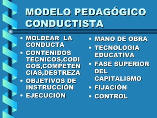 El documento describe diferentes modelos pedagógicos: el tradicional se centra en la disciplina, contenidos y repetición; el conductista busca moldear la conducta a través de objetivos de instrucción; el romántico promueve la libertad, espontaneidad y al maestro como amigo; el desarrolista enfatiza el desarrollo intelectual progresivo; y el socialista persigue el desarrollo pleno del ser a través del trabajo productivo y lo social. También menciona conceptos como pedagogía, didáctica, currí