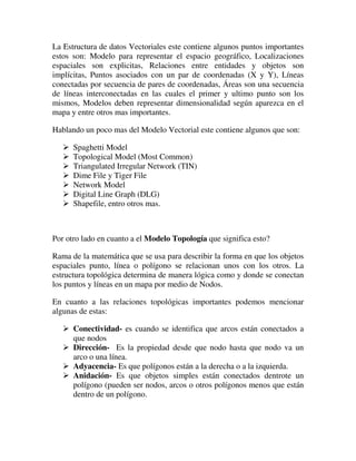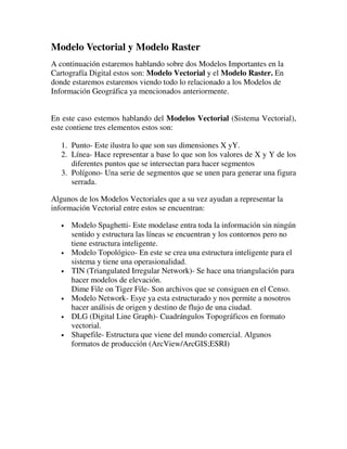 Este documento resume dos modelos importantes de información geográfica: el modelo vectorial y el modelo raster. El modelo vectorial representa la información geográfica mediante puntos, líneas y polígonos definidos por coordenadas. El modelo raster divide el espacio geográfico en una malla regular de celdas y asigna un valor a cada celda. El documento explica los componentes, estructuras de datos, ventajas y desventajas de cada modelo.