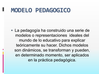 Este documento presenta una descripción de varios modelos pedagógicos, incluyendo el modelo pedagógico tradicional, romántico, conductista, constructivista y social. Cada modelo se define por sus metas, métodos, desarrollo, contenidos y la relación entre maestro y alumno.