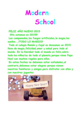 Este documento da la bienvenida al año nuevo 2015 y desea felicidad, amor y salud para todos. También habla sobre la magia de la Navidad y la alegría de pasar tiempo con la familia y amigos. Incluye algunos chistes cortos y una encuesta sobre si deberían poner redes en las porterías. Finalmente, resume las actividades de un festival navideño reciente que incluyó chocolate con churros, villancicos en inglés y español.