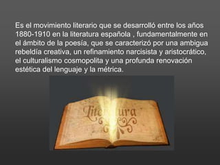 El modernismo fue un movimiento literario que se desarrolló en España entre 1880-1910, caracterizado por una renovación estética del lenguaje y la métrica, así como por un culturalismo cosmopolita y ambigua rebeldía creativa. Se trató de una corriente heredera del postromanticismo que dio una salida a esta estética en las demás artes como el Art Nouveau. El modernismo hispánico sintetizó el parnasianismo y el simbolismo francés, buscando la perfección formal y sugiriendo a través de imágenes