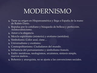 El documento resume los principales aspectos del Modernismo y la Generación del 98 en España. El Modernismo, influenciado por el simbolismo francés, se caracteriza por su esteticismo, cosmopolitismo y experimentación formal. La Generación del 98 surge tras la pérdida de las colonias y se enfoca en el análisis social a través de la novela y el ensayo de forma sencilla. Incluye figuras como Azorín, Baroja, Unamuno y Machado.