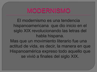 El documento describe el modernismo como una tendencia literaria hispanoamericana del siglo XIX que revolucionó las letras de habla hispana. Explica las características del modernismo como una actitud de vida y no solo un movimiento literario. También resume las influencias del parnasianismo y simbolismo franceses en el modernismo, así como sus temas principales como la modernidad y el arte. Finalmente, resalta que la poesía fue el género más difundido por los autores modernistas.