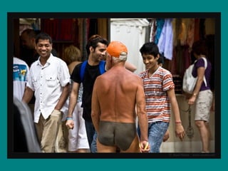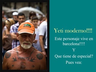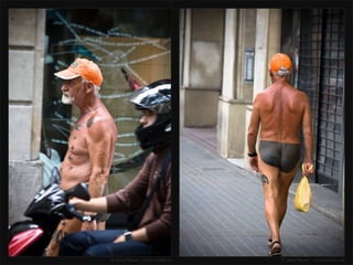 Este documento describe brevemente a un hombre que se pasea desnudo por las calles de Barcelona, mostrando solo sus tatuajes. Algunas personas lo miran con asombro o placer, mientras que otros le piden que se vista.