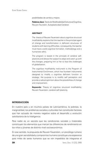 La teoría de la modificabilidad estructural cognitiva de Reuven Feuerstein explica que el maestro es el principal agente de cambio para transformar las estructuras deficientes de los estudiantes con dificultades de aprendizaje. El programa se basa en el principio de autoplasticidad cerebral y permite al sujeto adaptarse a los cambios mediante catorce instrumentos diseñados para modificar funciones cognitivas deficientes. El objetivo es modificar la autopercepción y proporcionar optimismo sobre las posibilidades de cambio.