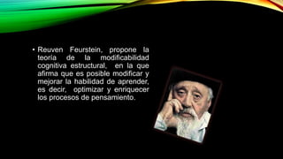 Reuven Feuerstein propuso la teoría de la modificabilidad estructural cognitiva, la cual afirma que es posible mejorar la habilidad de aprendizaje a través de la modificación y optimización de los procesos de pensamiento. El desarrollo cognitivo puede verse afectado por factores genéticos, ambientales y la calidad de la interacción y mediación en el aprendizaje. El aprendizaje mediado, a través de un mediador como un maestro o padre, puede crear una propensión al cambio des