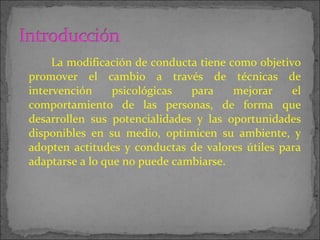 La modificación de conducta busca promover el cambio de comportamiento a través de técnicas psicológicas para mejorar la adaptación de las personas. Implica aplicar sistemáticamente los principios del aprendizaje para evaluar y mejorar los comportamientos manifiestos y encubiertos mediante el uso de refuerzos positivos, extinción, castigo u otros métodos. Un objetivo clave es identificar las necesidades de los estudiantes y llevarlos a funcionar de manera positiva en el aula a través de un trabajo conjunto entre psicólog