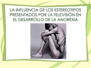 Este documento describe un proyecto de investigación sobre la influencia de los estereotipos presentados por la televisión en el desarrollo de la anorexia. El proyecto examinará los estereotipos de belleza femenina transmitidos por la televisión y su relación con la iniciación y progresión de la anorexia a través de entrevistas con expertos y testimonios de adolescentes con anorexia. El cronograma detalla las etapas del proyecto, que incluyen la recolección de datos, análisis y difusión de los