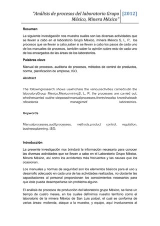 Este documento presenta un resumen de una investigación realizada sobre el análisis de procesos de producción en el laboratorio Grupo México, Minera México. El estudio tuvo como objetivo diagnosticar posibles problemas en el laboratorio y sus causas, a través de la observación de procesos y identificación de problemas en áreas como molienda, ataque a muestras y equipo. Se aplicaron entrevistas al personal para evaluar capacitación, equipamiento y seguimiento de manuales de procesos.