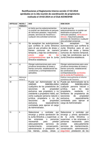 Este documento resume las modificaciones realizadas al Reglamento Interno de un condominio. Se realizaron cambios a 16 artículos para aclarar o ampliar su alcance. Las modificaciones abarcan temas como el uso de estacionamientos, facultades de la Junta Directiva, funciones del Administrador y normas de convivencia.