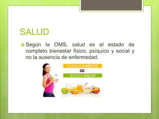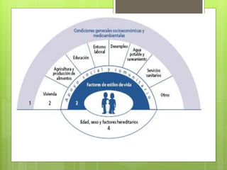 Este documento discute los conceptos de modo de vida, condiciones de vida y estilo de vida como determinantes de la salud. Explica que el modo de vida se refiere a las actividades diarias de las personas y cómo satisfacen sus necesidades, las condiciones de vida son las características del entorno físico y social de una persona, y el estilo de vida son las formas particulares en que una persona integra su modo y condiciones de vida a través de hábitos y comportamientos. También describe cómo estos conceptos operan a niveles macrosocial, grup