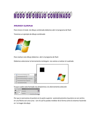 Este documento proporciona instrucciones paso a paso para crear un dibujo combinado en Adobe Flash que consiste en cuatro cuadrados rotados y coloreados que se agrupan como un solo conjunto. Se explica cómo utilizar las herramientas de rectángulo, selección, transformación libre y grupo para dibujar y modificar las formas y cómo usar la herramienta de color para colorear los cuadrados.