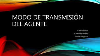 El documento describe los modos de transmisión de un agente infeccioso, incluyendo la transmisión directa de persona a persona, la transmisión indirecta a través de vehículos como objetos contaminados o vectores como insectos, y la transmisión a través del aire por aerosoles o partículas pequeñas. Explica que la transmisión puede ser directa o indirecta, y que los vectores pueden transmitir el agente de forma mecánica o biológica.