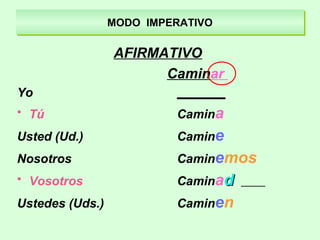 El documento proporciona instrucciones sobre la conjugación de verbos en modo imperativo en español. Explica las formas afirmativas e irregulares del imperativo para diferentes personas y números. También cubre verbos reflexivos e imperativos con pronombres complementos.