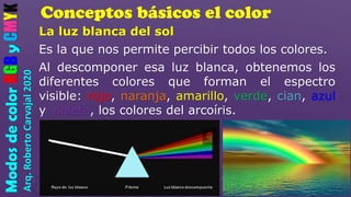 El documento explica los modos de color RGB y CMYK. RGB se refiere al modo de color aditivo utilizado en pantallas y se basa en los colores primarios rojo, verde y azul. CMYK se refiere al modo de color sustractivo utilizado en impresión y se basa en los colores primarios cian, magenta, amarillo y negro.