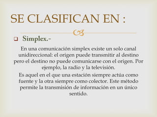Hay tres tipos principales de comunicación: simplex, half-duplex y full-duplex. En la comunicación simplex la información solo puede fluir en una dirección. En la comunicación half-duplex la información puede fluir en ambas direcciones pero no simultáneamente. En la comunicación full-duplex la información puede fluir en ambas direcciones al mismo tiempo sin degradar la calidad del servicio.