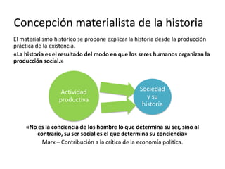 El documento resume la concepción materialista de la historia de Marx. Explica que la actividad productiva de los seres humanos condiciona el proceso social, político y espiritual. Define el modo de producción como la unidad de las fuerzas productivas y las relaciones de producción de una sociedad. Describe los diferentes modos de producción históricos, incluyendo la comunidad primitiva, el modo asiático, el esclavismo, el feudalismo, el capitalismo y el socialismo.
