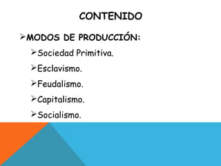 El documento resume los principales modos de producción a través de la historia, incluyendo la sociedad primitiva, el esclavismo, el feudalismo, el capitalismo y el socialismo. Cada modo de producción se caracteriza por su relación entre los trabajadores y los medios de producción, así como por su estructura económica y social subyacente.