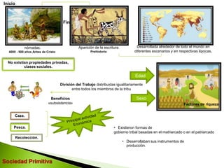El documento examina la evolución de las sociedades desde la prehistoria hasta el capitalismo, abordando la aparición de la escritura, la división del trabajo y los regímenes de propiedad a lo largo de la historia. Se destacan los sistemas de esclavitud en las primeras civilizaciones, feudalismo tras la caída del Imperio Romano, y la estructura del capitalismo moderno. Además, se discuten las condiciones laborales y la movilidad social en cada etapa, así como la participación del estado en la economía.