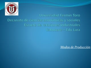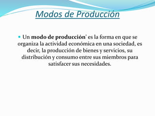 El documento describe los diferentes modos de producción que han existido a lo largo de la historia según la teoría marxista. Estos incluyen el comunismo primitivo, el modo de producción esclavista, el modo de producción asiático, el modo de producción feudal y el modo de producción capitalista. Cada uno se caracteriza por un determinado nivel de desarrollo de las fuerzas productivas y una forma particular de relaciones de producción.