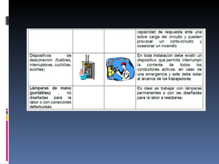 La electricidad es una forma de energía que se transporta y transforma fácilmente. Existen elementos que protegen los circuitos eléctricos como los fusibles y los que protegen a las personas como los interruptores diferenciales. Los principales accidentes son el cortocircuito y la sobrecarga, por lo que es importante aislar las partes activas, usar tensiones bajas y conexiones a tierra para prevenir contactos eléctricos.