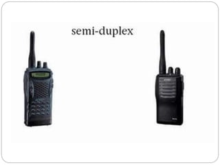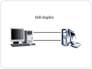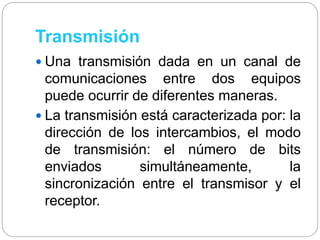 Existen tres modos de transmisión de datos caracterizados por la dirección del flujo de datos: conexión simplex (unidireccional), semi-dúplex (bidireccional pero no simultáneo), y dúplex total (bidireccional simultáneo). Los datos también pueden transmitirse en serie (de forma secuencial) o en paralelo (múltiples bits al mismo tiempo). La transmisión puede ser asíncrona (sin sincronización) o síncrona (transmisor y receptor sincronizados con un reloj común).