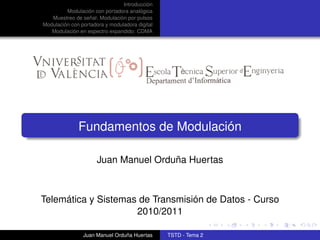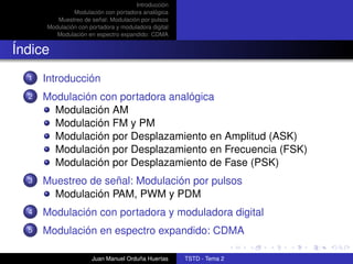 El documento presenta diferentes tipos de modulación analógica y digital. Introduce la modulación AM, describiendo su definición y espectro. Luego cubre la modulación FM y PM, y sus relaciones. Finalmente, introduce otros tipos de modulación como ASK, FSK y PSK. El objetivo es explicar los fundamentos y clasificación de las técnicas de modulación utilizadas en transmisión de datos.