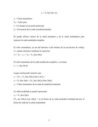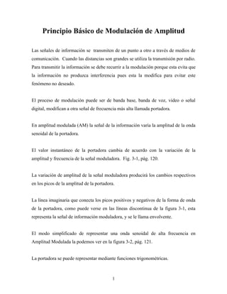 Este documento explica los principios básicos de la modulación de amplitud (AM). La AM varía la amplitud de una onda portadora sinusoidal para transmitir información. Esto genera bandas laterales superiores e inferiores que contienen la información. Un modulador combina matemáticamente la señal portadora y la señal moduladora para producir la onda AM final.