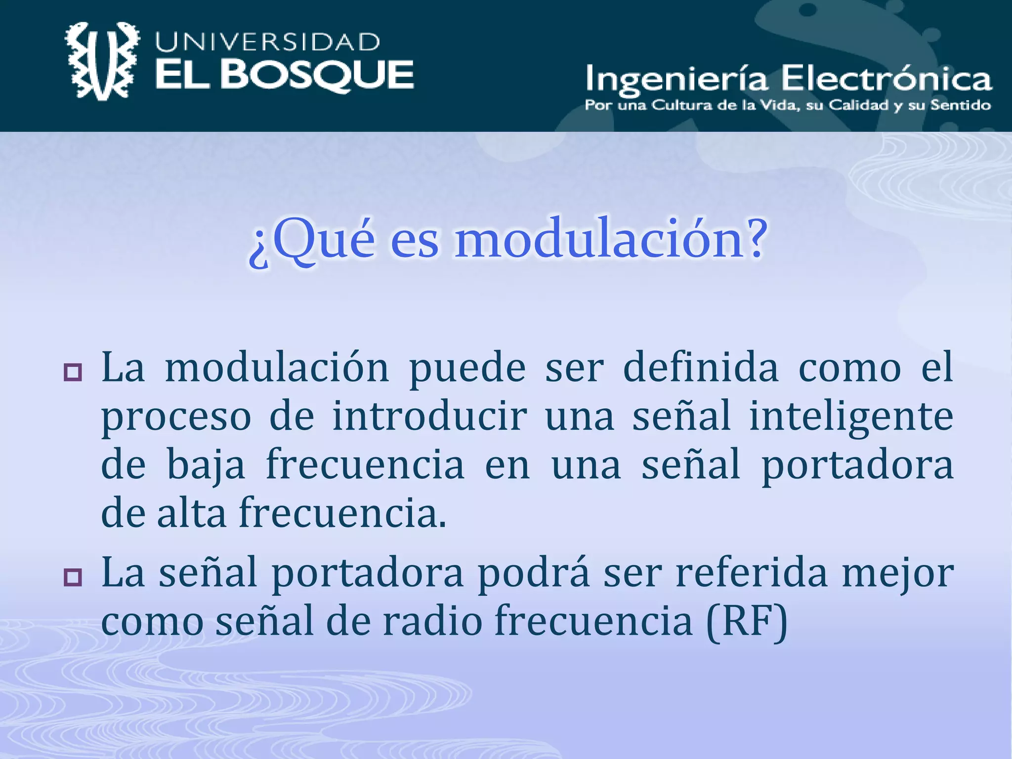 El documento trata sobre la modulación de amplitud (AM). La modulación AM consiste en introducir una señal de baja frecuencia en una señal portadora de alta frecuencia a través de un proceso no lineal. Esto genera bandas laterales por encima y por debajo de la frecuencia portadora que contienen la información de la señal moduladora. La modulación AM se utiliza comúnmente para transmitir señales de radio y requiere un ancho de banda doble a la frecuencia máxima de la señal moduladora.