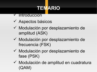 Este documento presenta una introducción a la modulación digital, incluyendo los métodos de modulación por desplazamiento de amplitud (ASK), frecuencia (FSK) y fase (PSK). También describe la modulación de amplitud en cuadratura (QAM) y discute el ancho de banda requerido para cada método. Finalmente, explica cómo se aplica la modulación digital a la televisión digital, incluyendo los esquemas de modulación utilizados comúnmente como QPSK, QAM, 16-QAM y 64-QAM.