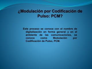 Este documento describe el proceso de modulación por codificación de pulso (PCM). Explica que la PCM digitaliza señales analógicas mediante cuantización y codificación. El proceso implica muestreo, cuantización de los niveles de amplitud en valores digitales, y codificación de estos valores en una secuencia de bits. La PCM ofrece ventajas como regeneración de señales, bajo ruido, y facilidad de almacenamiento. Su principal desventaja es el alto ancho de banda requerido.