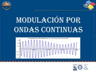 Este documento describe tres tipos principales de modulación por ondas continuas: modulación por amplitud (AM), modulación por frecuencia (FM) y modulación por fase (PM). Explica que la modulación implica variar características de una onda portadora como amplitud, frecuencia o fase en función de una señal moduladora que contiene la información a transmitir. Detalla cada tipo de modulación indicando qué característica de la onda portadora se modifica y presenta ejemplos como la modulación ASK y BPSK.