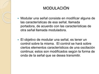 Este documento describe la modulación de pulsos en amplitud (PAM) para la transmisión de señales. PAM modifica la amplitud de una señal portadora continua según la forma de onda de la señal moduladora. Mide la amplitud de la señal moduladora a intervalos iguales y genera una serie de pulsos basados en esos resultados. Aunque PAM convierte una señal analógica en pulsos, la amplitud sigue siendo analógica y no digital, por lo que se requiere modulación de código de pulso (P