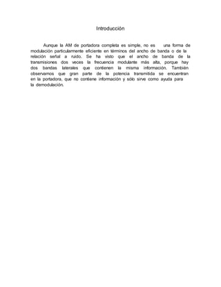 Este documento trata sobre diferentes tipos de modulación de amplitud, incluyendo la modulación de doble banda lateral con portadora completa (AM DSBFC), la modulación de banda lateral única con portadora completa (AM SSBFC), y la modulación de doble banda lateral con portadora suprimida (AM DSBSC). Explica conceptos como el espectro de frecuencias de una señal modulada en amplitud y cómo se puede ahorrar ancho de banda al eliminar una de las bandas laterales o la portadora.