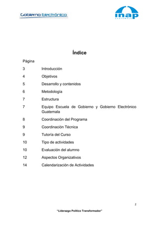 Este documento presenta la guía del participante para el curso "Liderazgo Político Transformador" ofrecido por el Instituto Nacional de Administración Pública de Guatemala. Explica los objetivos del curso, que son generar competencias de liderazgo transformador en funcionarios públicos a través del estudio de la estructura política y administrativa del estado. Describe la metodología, contenidos, evaluaciones, equipo docente y calendario del curso de cinco módulos que se llevará a cabo de forma virtual durante varias semanas.