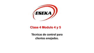 Este documento presenta técnicas para manejar clientes enojados y resolver conflictos de manera constructiva. Explica que es importante definir el problema, explorar sus causas, mostrar empatía, buscar soluciones alternativas y llegar a un acuerdo satisfactorio. También describe habilidades como escuchar activamente, desarrollar asertividad y negociar reglas claras para resolver conflictos de manera efectiva.
