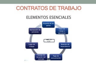 El documento presenta un modelo de contrato de trabajo a plazo indefinido que incluye 10 cláusulas sobre el objeto, duración, lugar de trabajo, remuneración, obligaciones de las partes, legislación aplicable y jurisdicción. También cubre temas como causas de terminación de la relación laboral, incluyendo por acuerdo mutuo, causas ajenas a las partes o voluntad unilateral, y tipos de contratos como el de jornada parcial.
