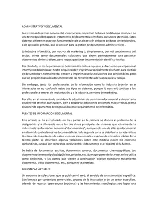El documento resume los sistemas de información organizacional, indicando que recopilan, clasifican, procesan e interpretan datos para sacar conclusiones y orientar la toma de decisiones. Explica que los sistemas de información y las tecnologías de la información han cambiado cómo operan las organizaciones al automatizar procesos y suministrar información para la toma de decisiones. También define los sistemas documentales como programas de gestión de bases de datos diseñados para documentos científicos, culturales y técnicos, diferenciándolos de
