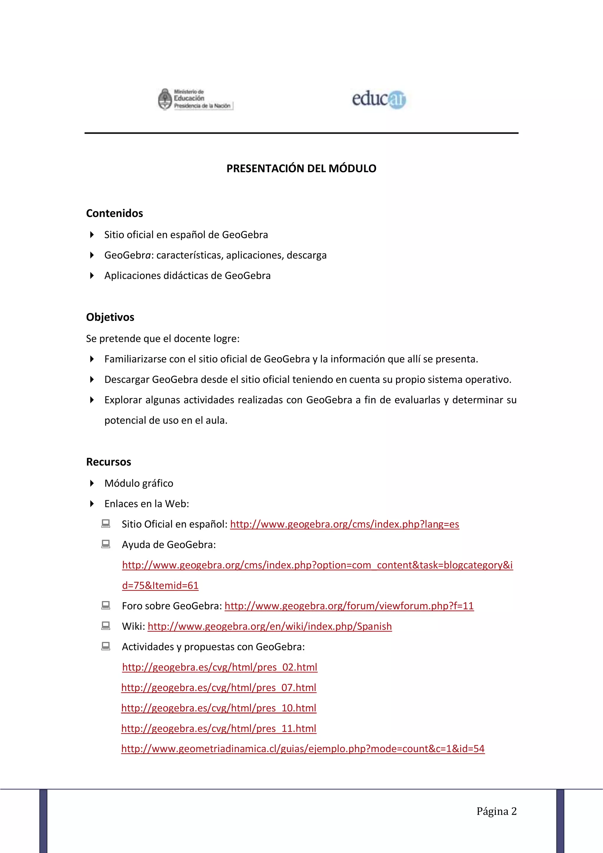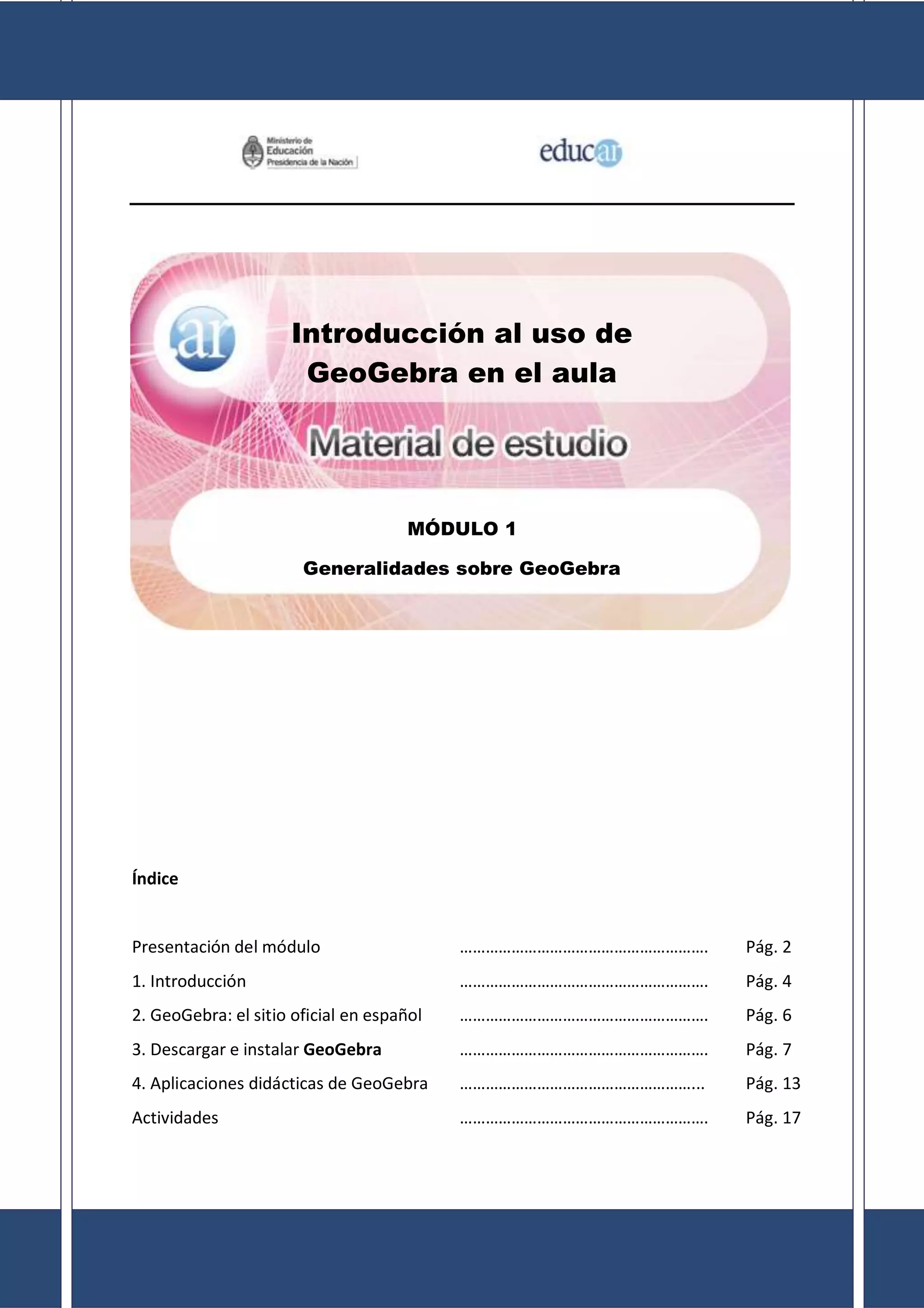 Este documento presenta una introducción al uso del software GeoGebra en el aula. Explica que GeoGebra es un programa de geometría dinámica que combina elementos de geometría, álgebra, análisis y estadística. El documento incluye instrucciones para descargar e instalar GeoGebra, y analiza algunas aplicaciones didácticas del software como visualizar conceptos matemáticos y realizar construcciones interactivas.