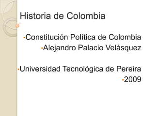 Este documento resume la historia de Colombia desde la independencia en 1810 hasta la constitución de 1991. Algunos de los eventos principales incluyen la creación de la Gran Colombia en 1819, la división entre federalistas y centralistas en 1826, la constitución de 1886, la pérdida de Panamá en 1903, y el surgimiento de las guerrillas en la década de 1960. El documento también discute la violencia entre liberales y conservadores en la década de 1940 y 1950.