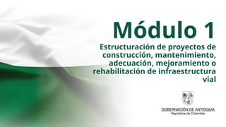 El documento describe el módulo 1 sobre la estructuración de proyectos de construcción y rehabilitación de infraestructura vial, abordando conceptos clave como el ciclo de proyectos de inversión y su formulación. Se detalla la planificación técnica necesaria para garantizar la viabilidad y ejecución óptima de proyectos, incluyendo estudios de tránsito, suelos, pavimentos y aspectos ambientales. Finalmente, se mencionan requisitos y entregables para la adecuada realización y monitoreo de estos proyectos, asegurando el cumplimiento de normativas vigentes.